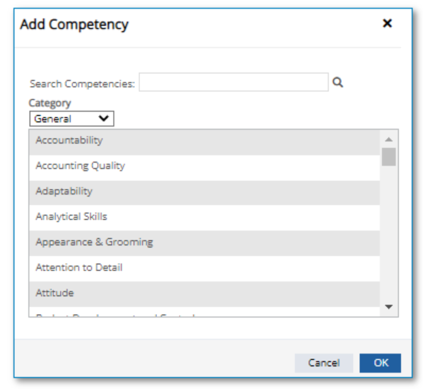 5. From the "Category" dropdown, select the category which contains the desired Competency. Click on the Competency and then OK.