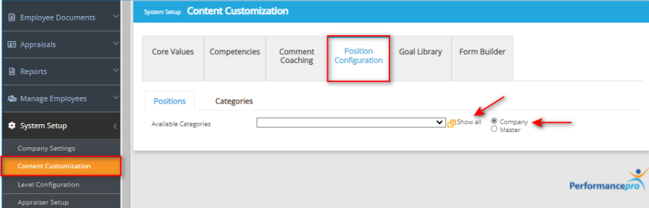 2. Next, make sure the Company radio button is selected and search for the position by clicking Show All.