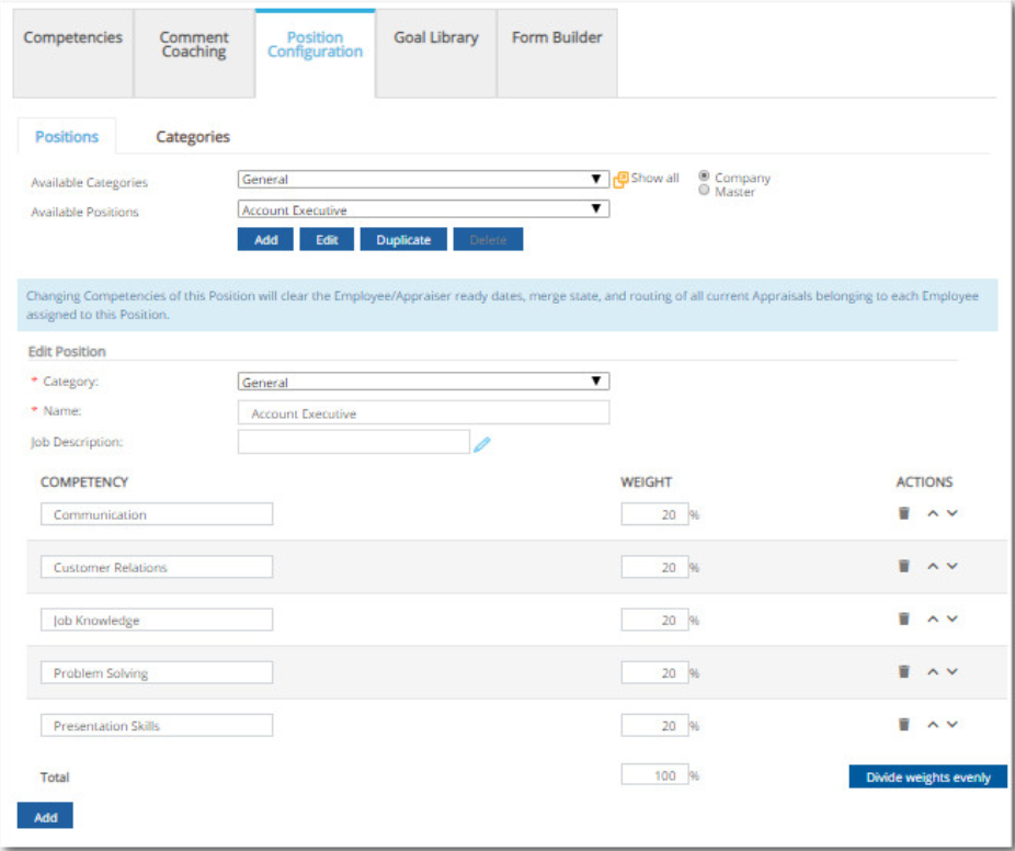 You might be asking why, despite the fact that your account's competencies are correctly set up, a prompt notifies you "There are no Competencies assigned to the position for the selected Employee," when viewing an employee's performance appraisal.