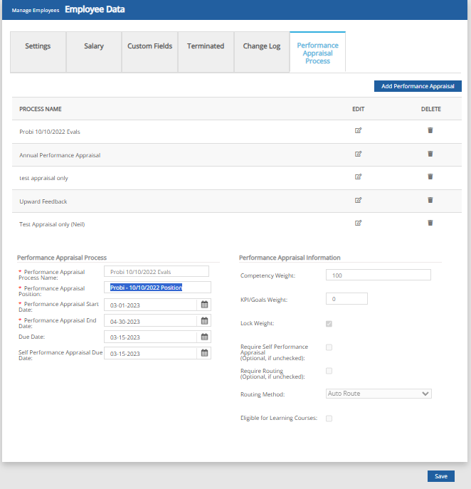 To resolve this, the appraisal can be removed and reassigned for this employee individually under the same page with the same parameters. The existing process can be removed using the Delete icon and a new added using the Add Performance Appraisal icon.