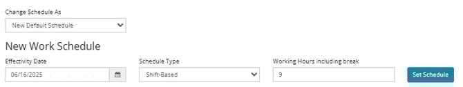 1. Go to Work Schedule > Change Schedule. Indicate that the changes would be for New Default Schedule then, select Shift-Based on Schedule Type and enter the Working Hours including break then click Set Schedule:
