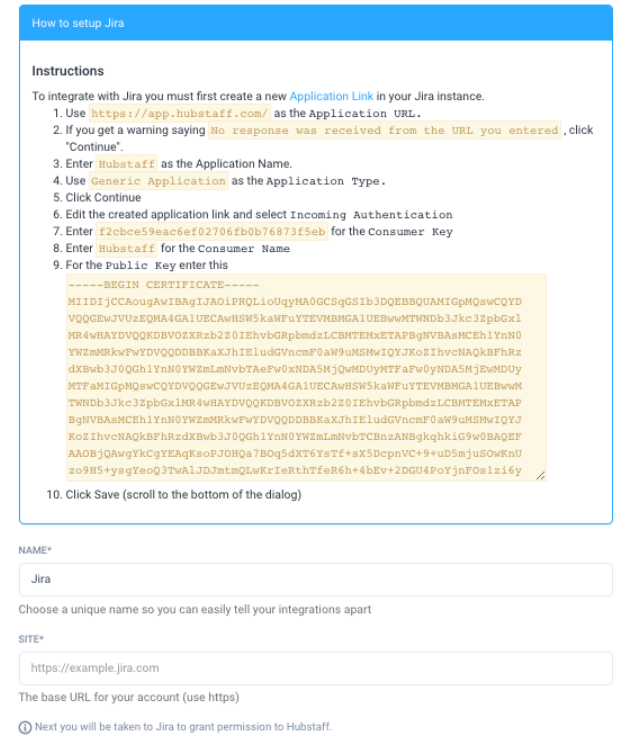 You will be asked to give your integration a name. You can choose anything here, the name is only for your reference. Click the Create Integration button, and you will be taken to a screen that gives you instructions on what you need to do to configure your Jira instance for the Hubstaff integration.