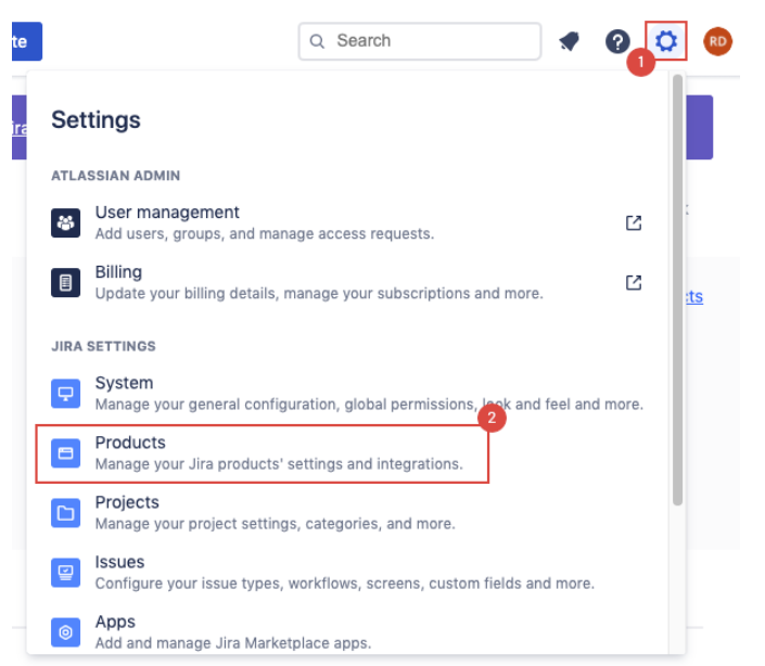 Log in to your Jira instance and create a new Application Link. On the top right corner click the Gear icon.
