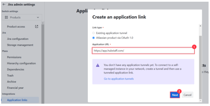 After clicking on Application links, make sure “Atlassian product via OAuth 1.0” is selected. Then you can enter https://app.hubstaff.com/ as the Application URL and click Next.