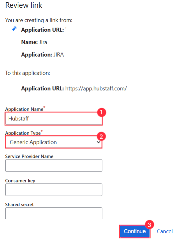 In the pop-up window that follows, enter Hubstaff as the Application Name, select Generic Application, and click Continue. Please note that you only need to fill up the first two fields (application name and application type) before clicking “continue”.
