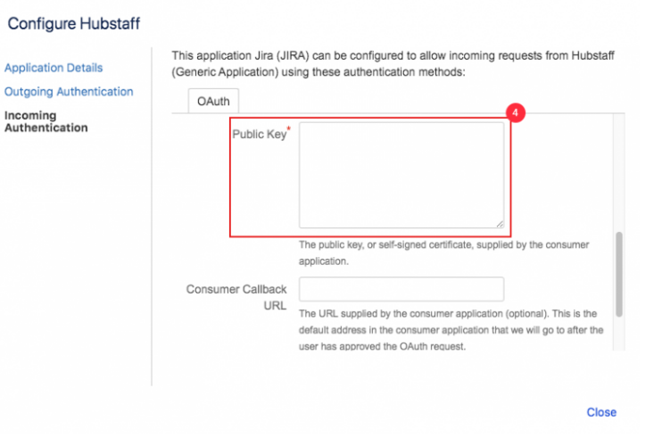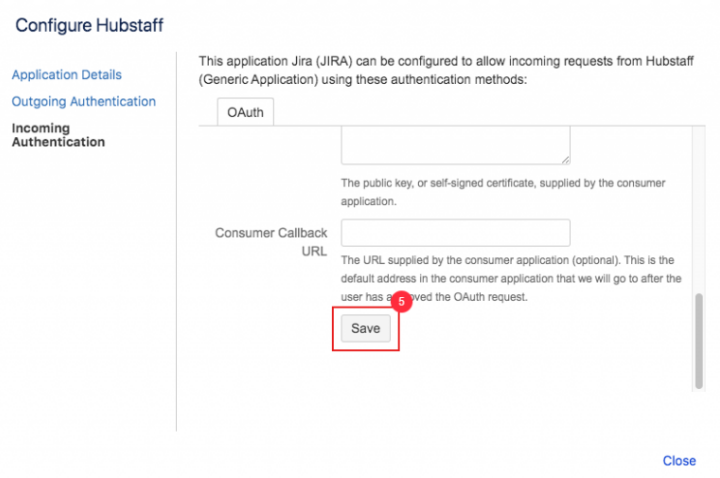Click on Incoming Authentication and enter the Consumer Key; this is shown in the JIRA integration set up instructions in Hubstaff on step 7. Then, type Hubstaff for the Consumer Name. Next, copy the long certificate from the JIRA integration setup on step 9 and paste that into the Public Key text box. Once you’ve gone through all these steps, scroll down towards the very end and click the Save button.