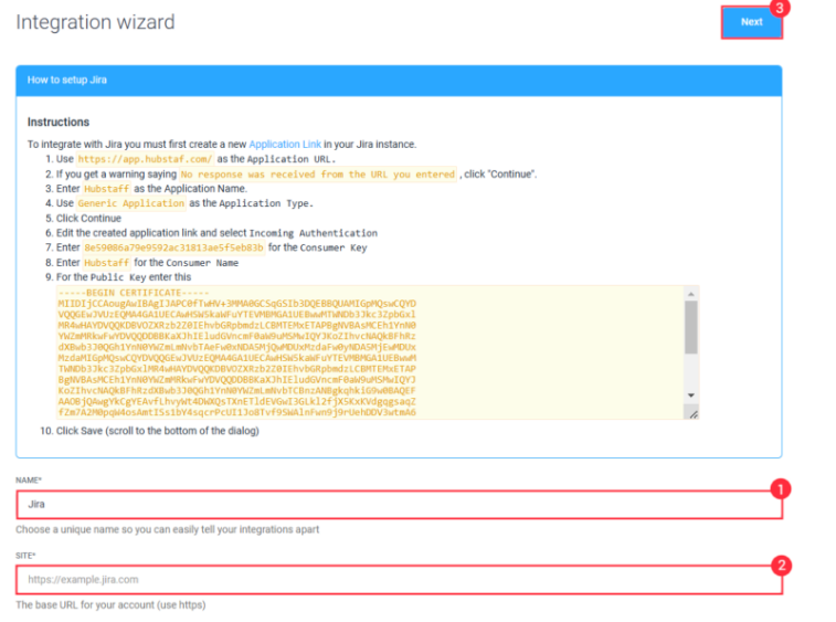 Back to the JIRA integration setup in Hubstaff. Name the integration whatever you like and paste your JIRA instance URL. Then click the Next button.