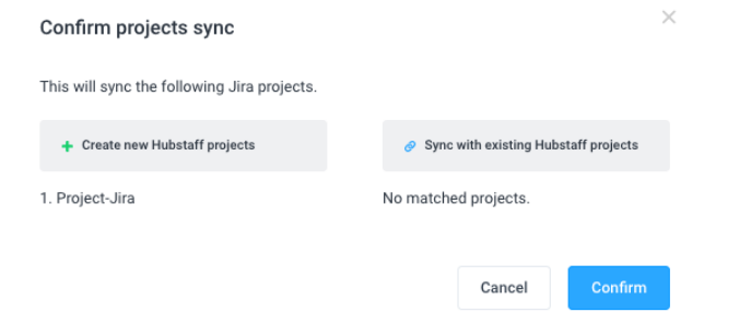 - Sync all – all projects are synced to Hubstaff, and if a project with the same name doesn’t exist, each new project will automatically be created and synced once you click on the Confirm button.
