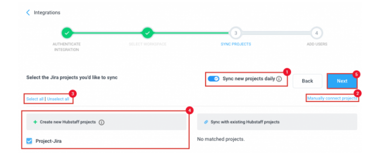 - Select from list – allows you to choose which projects to connect to Hubstaff. Check or uncheck project names on the left column. You can also enable the “Sync new projects daily” setting so all new projects are automatically linked to Hubstaff. You can also choose to manually sync projects. Choose either “Select All,” or “Unselect All,” or manually choose each project you wish to link to Hubstaff. Click on “Next” to move to the next step.