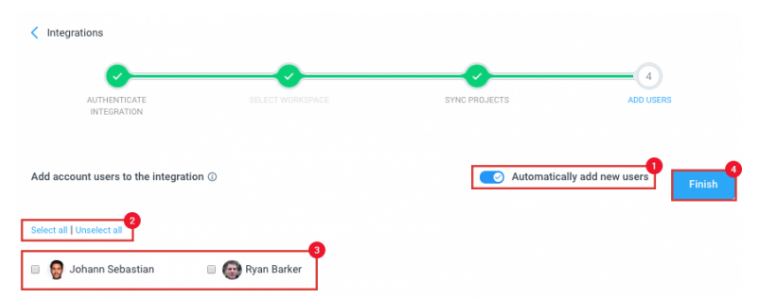 Next, you’ll need to connect users to your integration. Make sure the “Automatically add new users” option is enabled so that all new users added to Hubstaff are automatically added to your integration. You can also choose to “Select all,” “Unselect all,” or manually choose which users you want working on your integration. Click Finish to end the setup.
