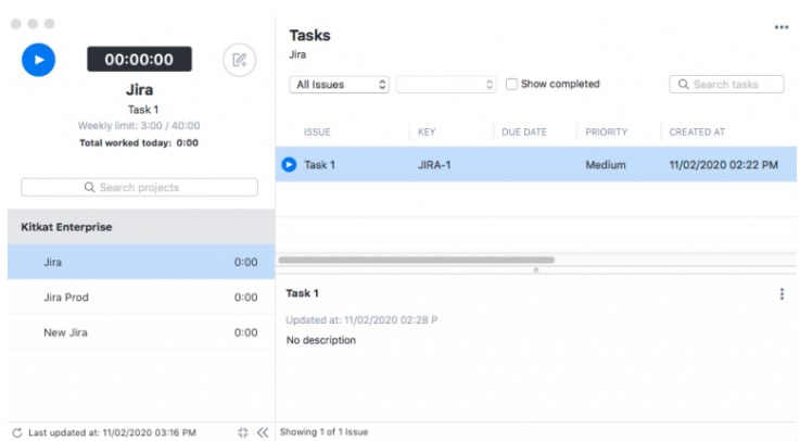 The desktop timer will have the tasks on the right side once the Jira project is selected.