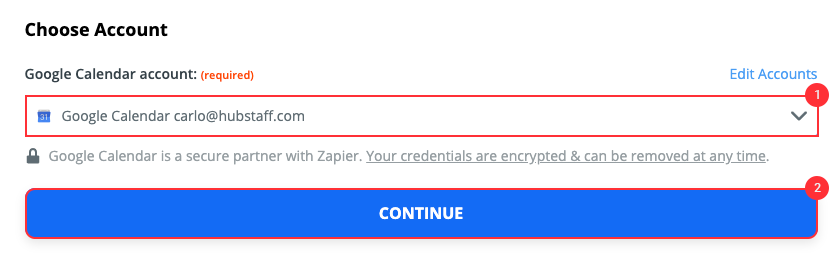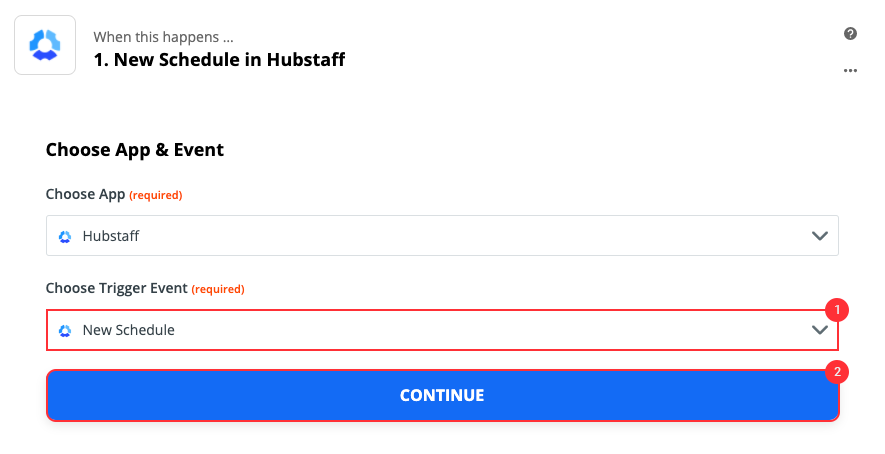 On the Choose App & Event field, type in Hubstaff then choose Hubstaff from the available options below.