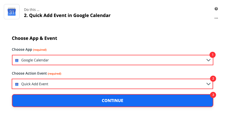 Choose Google Calendar from the Apps, then choose an Action Event: