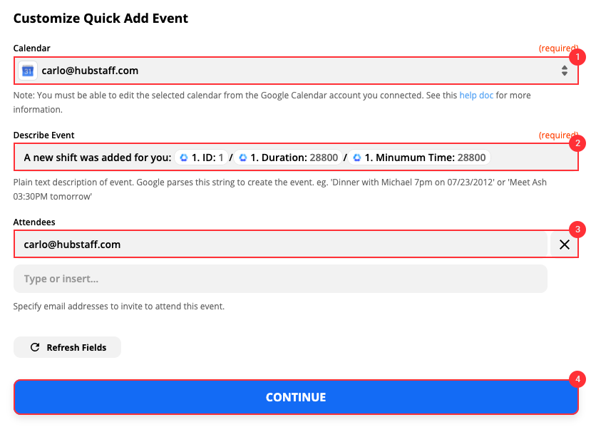 Configure your event. You may see different options here depending on the Action Event you chose in Step 6. Hit Continue when you’re done.