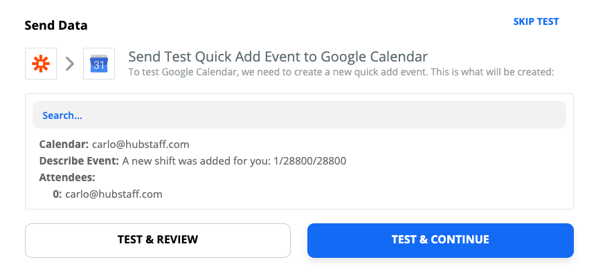 Click Test and Continue or Skip Test if you don’t wish to test the Zap. Turn the Zap on to finish the setup.