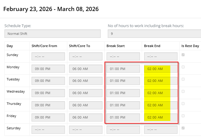 Then, for the future date, you will have to add a New Default Schedule, and please make sure that the Break Hours are correct and are within the employee’s Shift Schedule to avoid unnecessary undertime tagging in the employee's attendance.