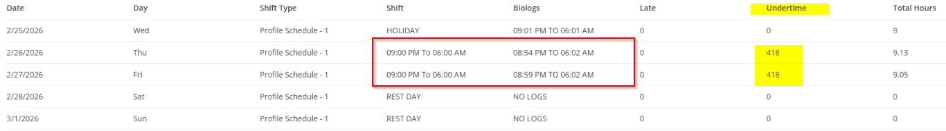 If you are seeing an undertime tagging in the attendance report, just like the sample image above, most likely the root cause is coming from the plotted Break Hours in the employee’s Work Schedule that are outside the Shift Schedule.