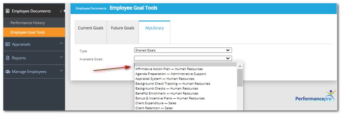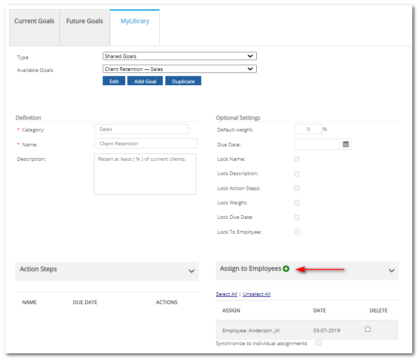This tool allows you to easily assign that goal to multiple employees, now and in the future. You will also have access to any Goals the Administrative User has shared with you.