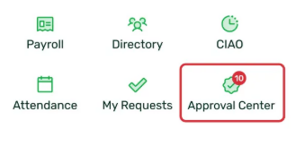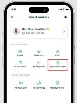 On the home screen of the Sprout Mobile App, you’ll find the Approval Center widget. This widget is only visible to users with a Manager or Admin Dashboard Type, as they have access to approve employee requests.
