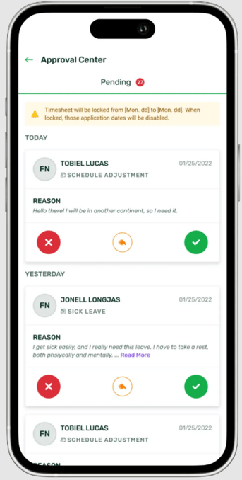 - Reject: Swipe the application to the left, or tap the Reject button on the approval card.