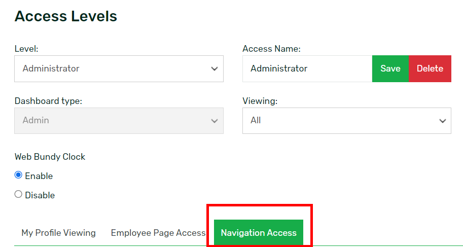 Go to the Access Levels page under the Maintenance Tab in your Sprout HR and select the Access Level you wish to edit from the Level dropdown list before clicking the Navigation Access tab:
