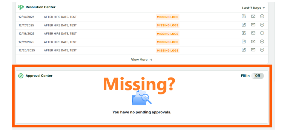 To resolve this, it’s important to first verify whether the manager is on an employee-level dashboard or has a user level assigned that corresponds to an employee rather than a manager/admin. If this is the case, the Approval Center simply won’t appear.