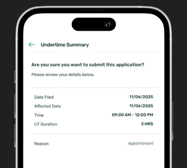 After providing a reason, you’ll see an overview of your Undertime Application. Review the details carefully, and if everything looks correct, tap Submit Application to proceed.