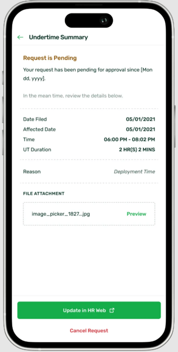 The Edit/Update functionality for Undertime (UT) requests is not available (yet!) in the Sprout Mobile App. For now, please open your UT request in Sprout HR via your web browser to make any changes or updates.