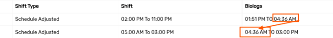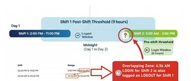 - The Overlap: Since 4:30 AM is within the 9-hour post-shift window for Shift 1 (11:00 PM to 8:00 AM), the system prioritizes the longer threshold and incorrectly assigns the 4:30 AM log as the logout for Shift 1, rather than the login for Shift 2.