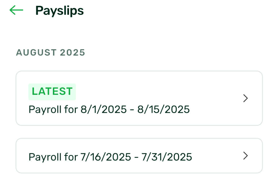 Step 3: Select the “Payslips” option to view your payslip history. This section displays your most recent payslip and provides guidance on the latest payslip posted to your account. Each payslip card includes the description of the payroll run which can include the payroll period, based on your company’s payroll processes. The list is sorted chronologically by month based on the transaction date of the payroll run, with the most recent payslip appearing first, followed by earlier ones.