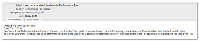 Making an entry in the Peer Feedback widget allows a record of the action to be added to the employee's Performance History. This becomes a great source of information when completing performance reviews. Activating the Peer Feedback widget will allow any employee to give feedback about any other employee in the system. There are no restrictions on who can give or receive feedback.