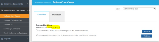 For first-time users of Perfomance+, the Terms and Conditions will appear when you click the Evaluate Core Values in the Performance Evaluation tab. See the sample below: