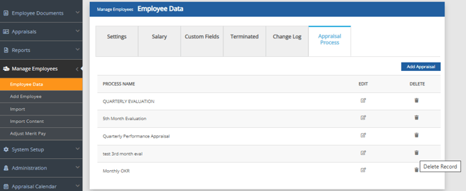 Select the Employee > Manage Employees > Employee Data > Appraisal Process. Please refer to the images below: