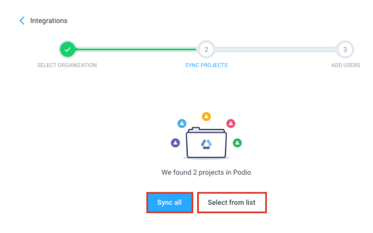 Afterwards, sync your Podio projects. Furthermore, you may choose to sync all existing projects, or manually choose from a list of projects you wish to connect.