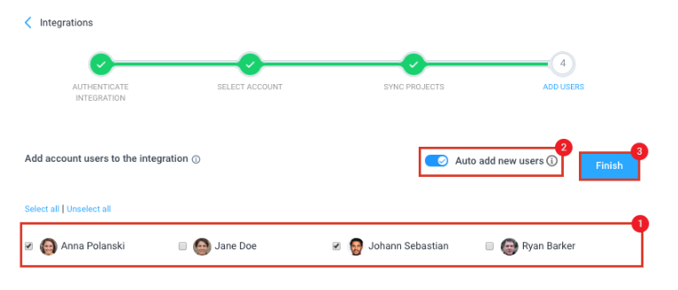 After connecting projects, connect users to your integration. You can select/unselect all users, choose individual users, and/or automatically add new users to this integration in the future. Click Finish to complete the integration set-up.