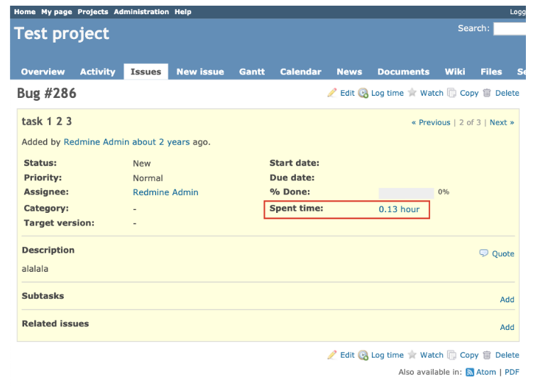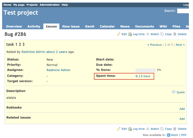 When your team members track time to Redmine issues/bugs using the Hubstaff app, the time they spent on a task will appear as a time entry on the Spent time section of the task as shown below.