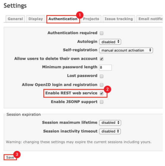 B. Click on the Authentication or API tabs to find the option to enable REST API/REST web service. Place a checkmark on the box then click Save: