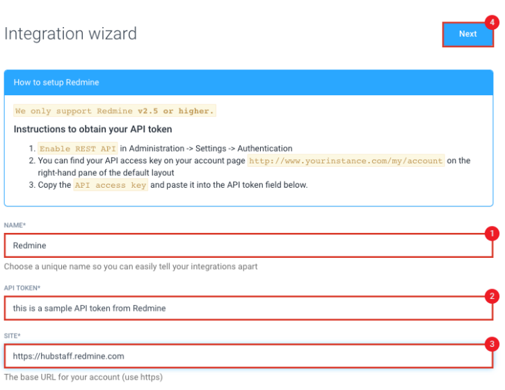 You’ll need to get your API Token (API Access key) from your Redmine Instance and your Redmine instance URL. Enable the REST web service (REST API) on your Redmine instance as well.