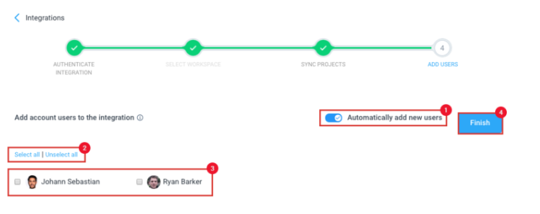 Next, you’ll need to connect users to your integration. Additionally, you can also choose to “Select all,” “Unselect all,” or manually choose which users you want working on your integration. Click Finish to end the setup.