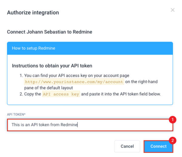 Next, the Authorize integration page will appear, from there, users can enter their personal Redmine account’s API token then hit Connect to authorize the integration.