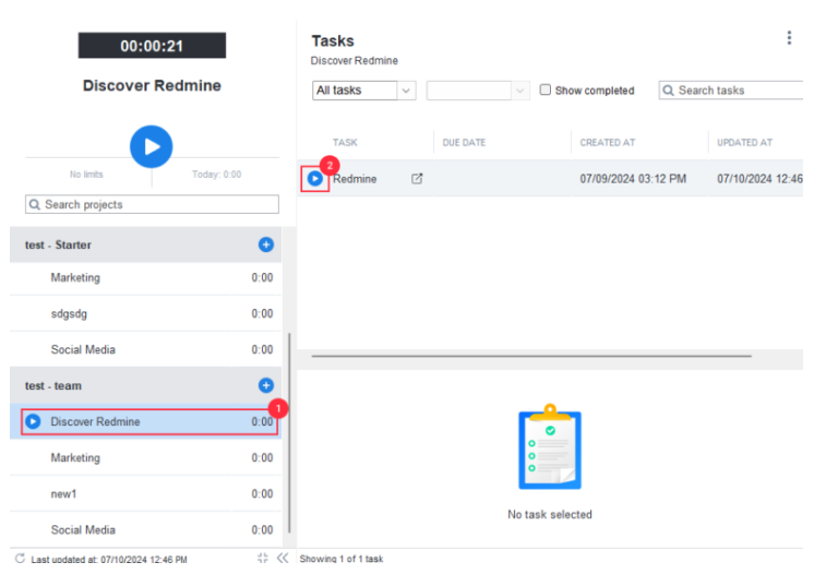 Tasks assigned to each user from Redmine will then appear on the Hubstaff time tracking application as shown below. To start working on a Redmine task, click on the project name, then press the Play button next to the task name to track time to your Redmine issue.