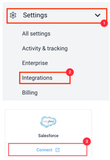 To get started, make sure you have selected the correct organization on the top right corner of the page. Then click on Settings > Integrations on the sidebar menu. Next, select the Salesforce logo from the list of available integrations under CRM integrations and click Connect.
