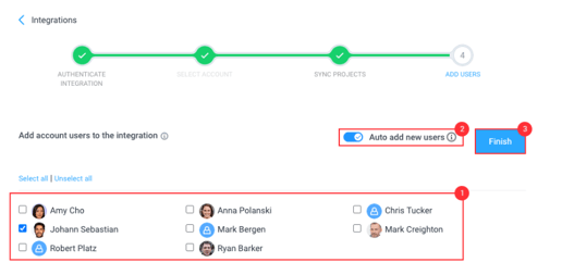 Next, you’ll be asked to connect users to your integration. You can select/unselect all users, choose individual users, and/or automatically add new users to this integration in the future. Click Finish to complete the integration set-up.