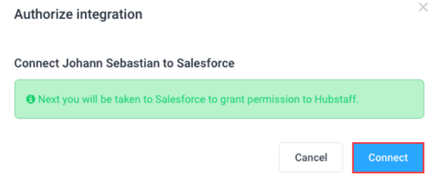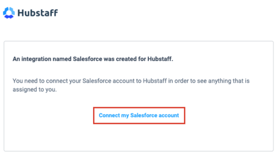 Next, you will be asked to give a name to the integration (you can name your Salesforce integration with any name that you want, it is just for your own reference). After doing that, click the Next button, where you will be taken to Salesforce to authorize the integration with Hubstaff: