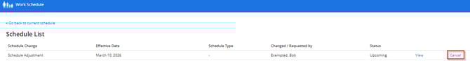 A Schedule Adjustment with “Upcoming” status can be canceled while the “Past” and “Current” schedules cannot.