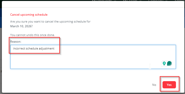 You will be prompted to confirm the cancellation of the schedule.