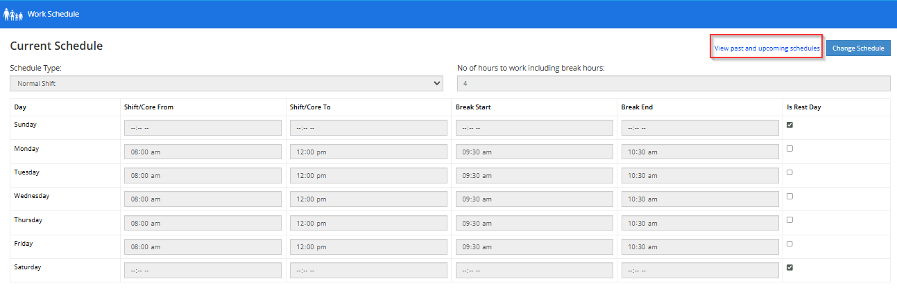 Step 2: Go to the “Work Schedule” tab, then click on “View past and upcoming schedules”.