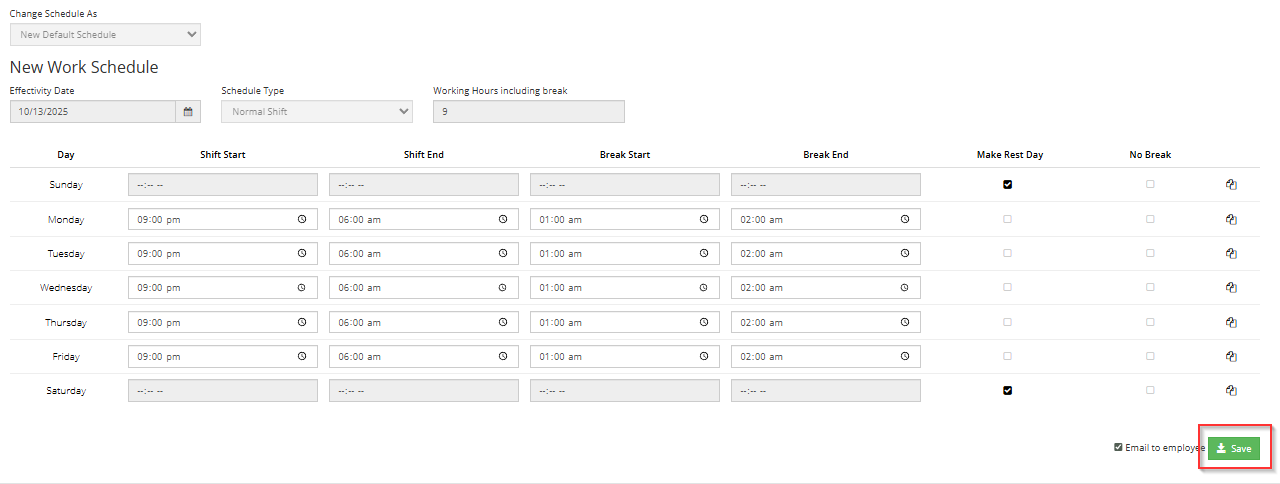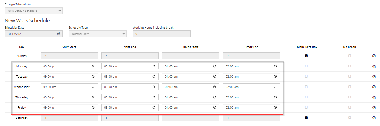 Step 4: Change the Shift details accordingly, aside from the “Change Schedule As”, “Effectivity Date”, “Schedule Type”, “Working Hours including break”. They are non-editable.