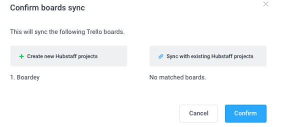 - Sync all – all projects are synced to Hubstaff, then if a project with the same name doesn’t exist, each new project will automatically be created and synced once you click on the Confirm button.