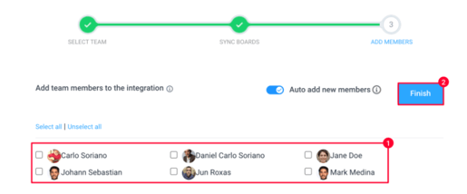 After that, you’ll need to connect users to your integration. Additionally, you can also choose to “Select all,” “Unselect all,” or manually choose which users you want working on your integration. Click Finish to end the setup.